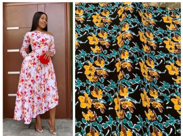 features vibrant floral prints with bright colors such as yellow, teal, and brown on a dark or light background, giving it a lively and elegant appearance. Such fabrics are commonly used for making dresses, skirts, blouses, or other fashion apparel, especially for summer or spring wear due to their airy and comfortable nature.
